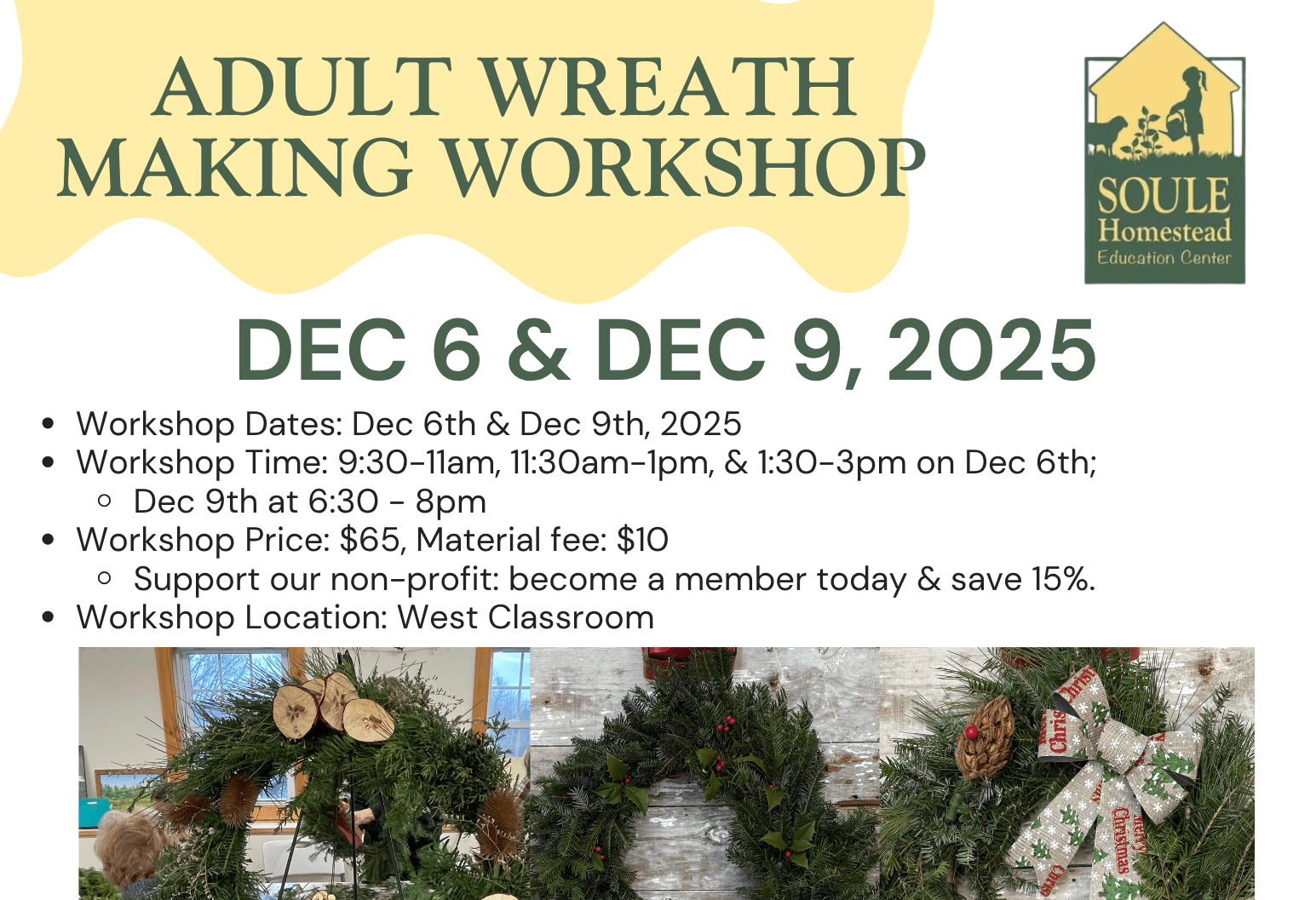 Create your own beautiful wreath in community with others at Soule Homestead’s Annual Wreath Making Workshop! Long-time volunteer and instructor, Mary Ann Cunningham and Director Kelly MacDonald Weeks will lead THREE Saturday sessions of wreath making workshops using freshly cut winter greens harvested at Soule. Director Kelly MacDonald Weeks will be leading the Tuesday evening workshop.