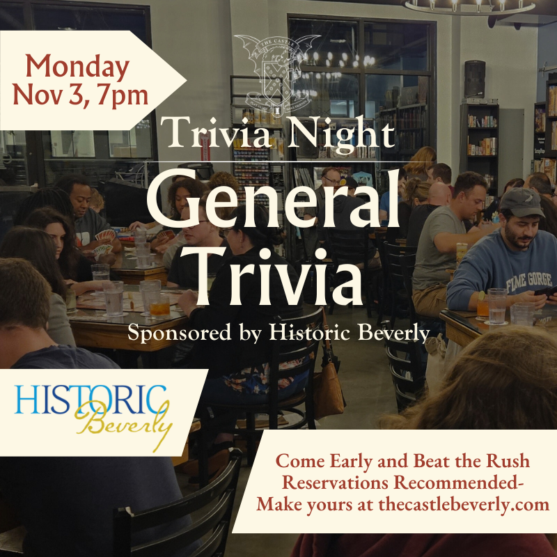 Join us for a night of general trivia sponsored by Historic Beverly! Trivia will start at 7PM and reservations can be made at 6:30PM to grab a bite to eat!