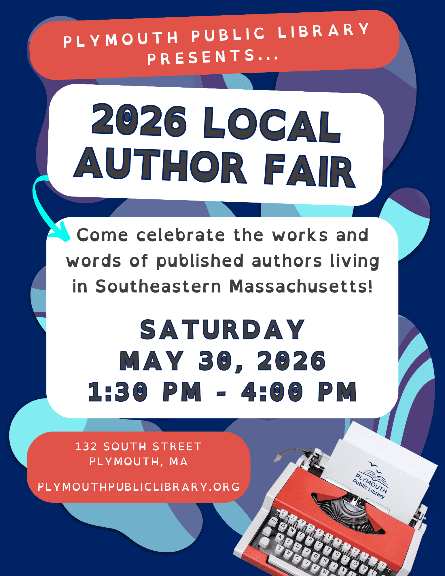 The Plymouth Public Library is pleased to announce our upcoming 3rd Annual Local Author Fair showcasing the talent and creativity of published authors and celebrating the vibrant literary community of Southeastern Massachusetts. This outdoor event offers a unique opportunity for authors to engage directly with readers, promote their work, and participate in short readings. Scheduled...
